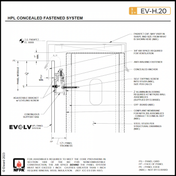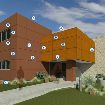 The EV-H.20 Concealed Fastener System, (formerly the ESC 210 system), is a Drained and Back Ventilated Rainscreen utilizing TRESPA high-pressure laminate (HPL) material. TRESPA is a solid and sturdy material that is highly scratch and impact resistant with an intergraded decorative surface, cured with proprietary EBC technology producing a low maintenance finish that is easy to clean. The material is available in 10mm and 13mm thicknesses and is mounted on a provided engineered concealed grid system, utilizing aluminum extrusions and concealed fasteners. With the wide range of colors the design choices are endless.